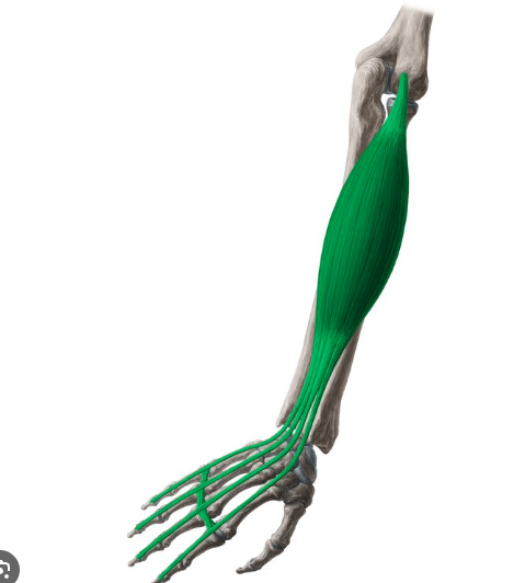 Ursprung Epicondylus lateralis – humerus Fäste Dorsala aponeuroser på fingrar II–V – digiti mani Funktion Extension i MCP/IP-leder; dorsalflexion i handled Innervation n. radialis (ramus profundus) Relaterat handled interphalangealleder