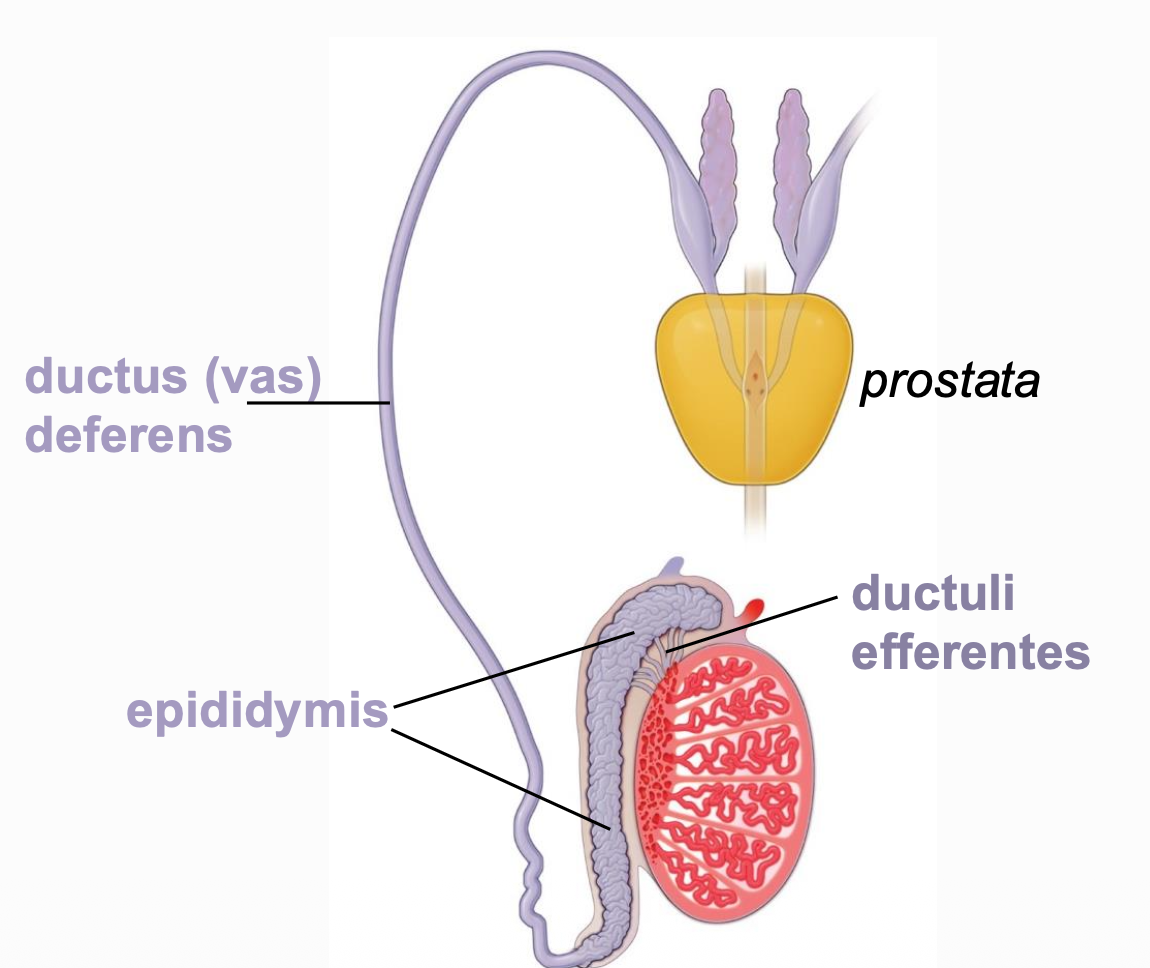 • Sekvens: tubuli seminiferi → rete testis → ductuli efferentes → ductus epididymis → ductus deferens → ductus ejaculatorius → uretra.