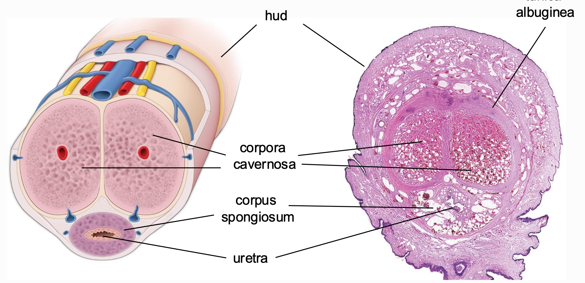 - Penis omges av tunn hud utan hårfolliklar men med svettkörtlar; under ligger subcutis med lös bindväv och nerver.