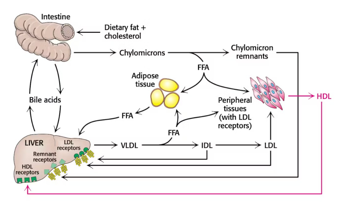 kost → levern → VLDL → IDL → perifier vävnad → HDL → lever